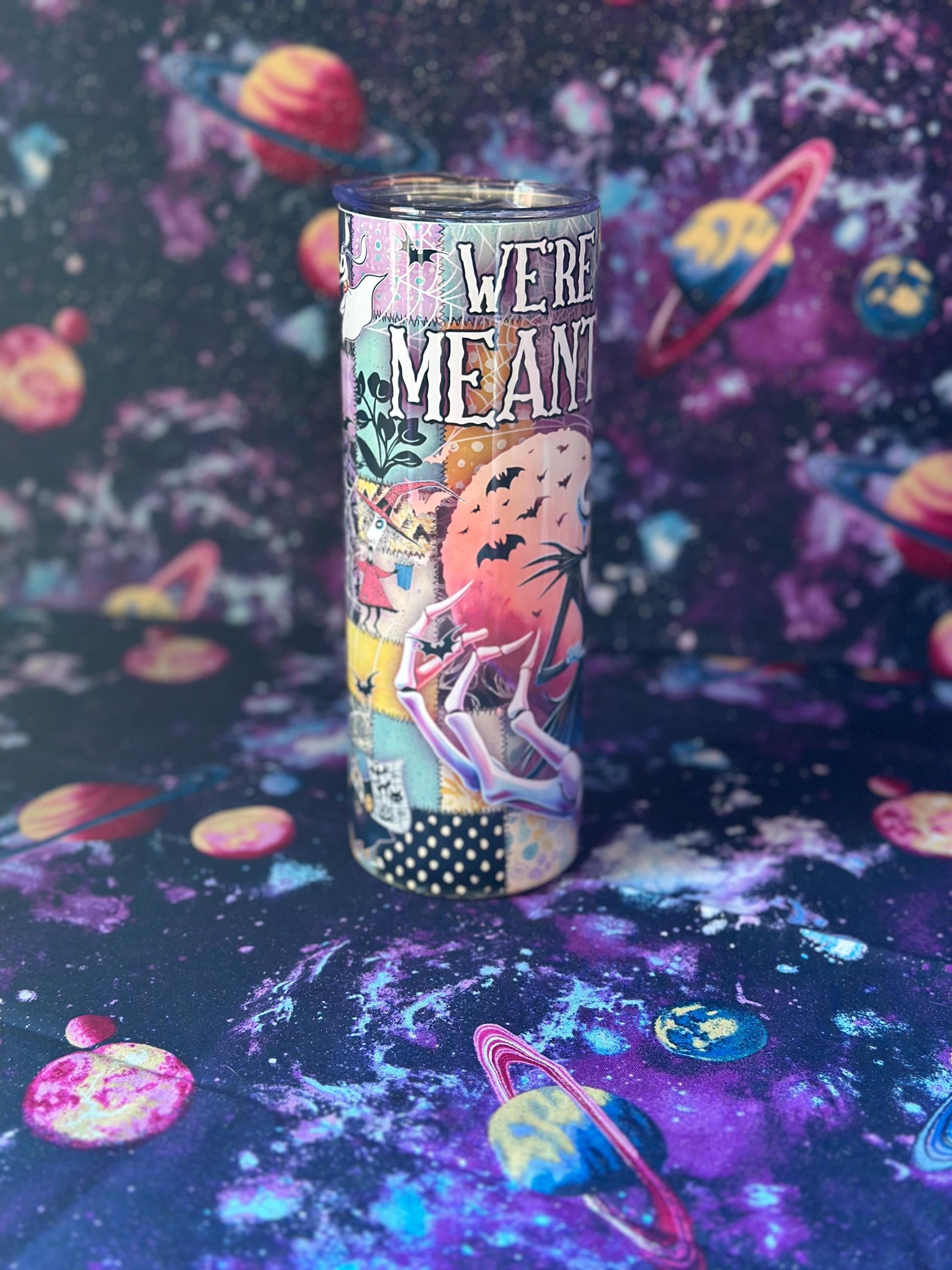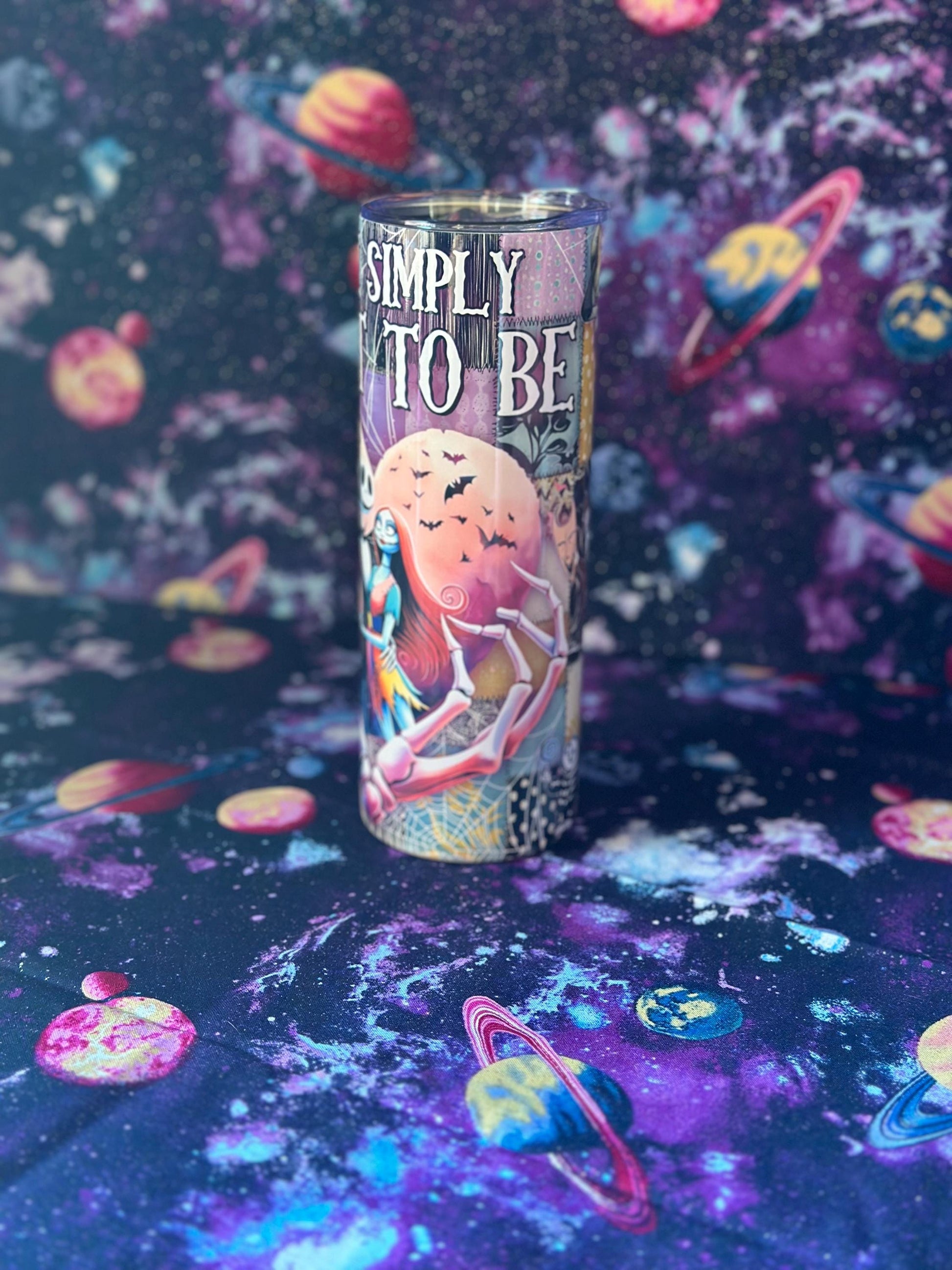 Celebrate spooky love with this beautiful Nightmare Before Christmas–inspired tumbler! Featuring Jack and Sally surrounded by bats, hearts, and moonlight, it’s perfect for fans who are “simply meant to be.” Made of stainless steel, it keeps drinks hot or cold for hours and includes a clear lid and straw.
