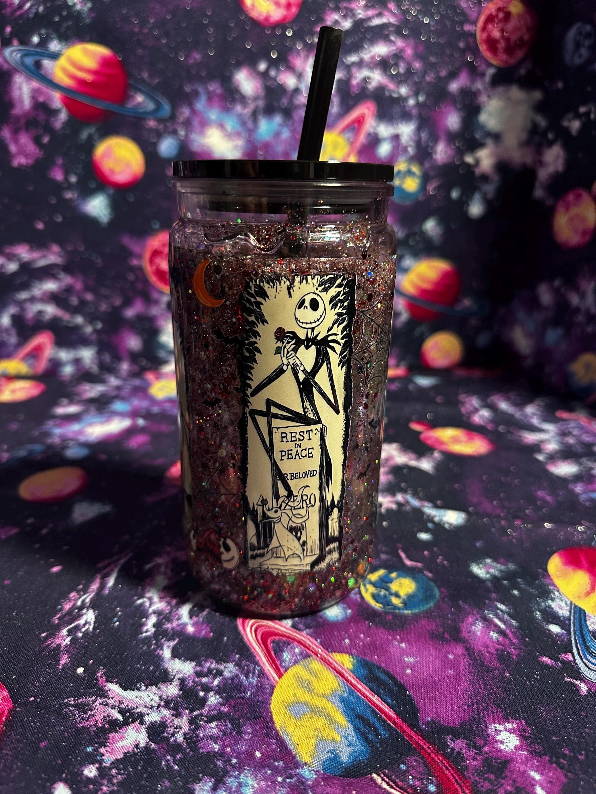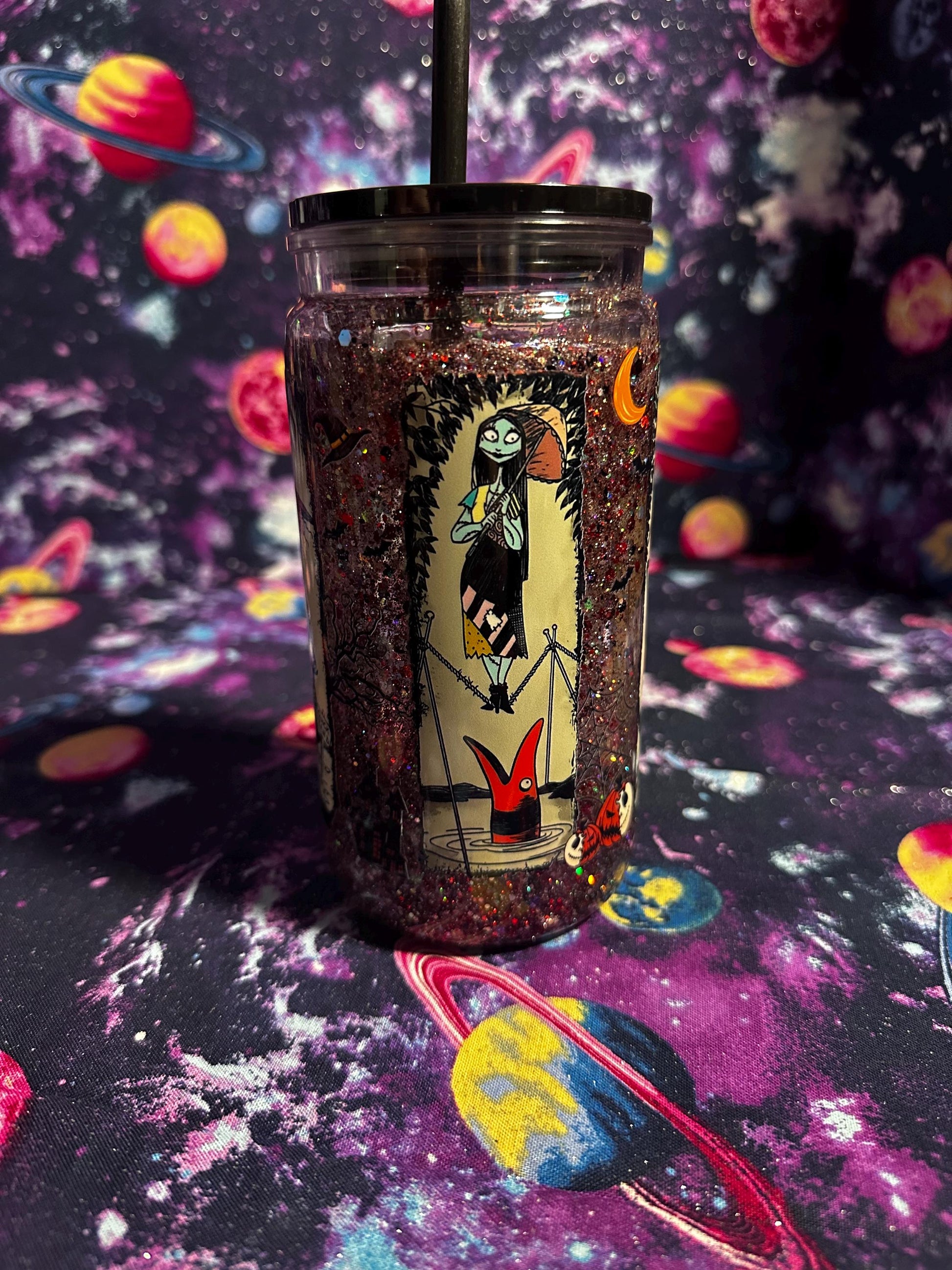 This Nightmare Before Christmas-inspired cup features Jack, Sally, Oogie Boogie, and the mischievous trio Lock, Shock, and Barrel surrounded by spooky glitter swirls.