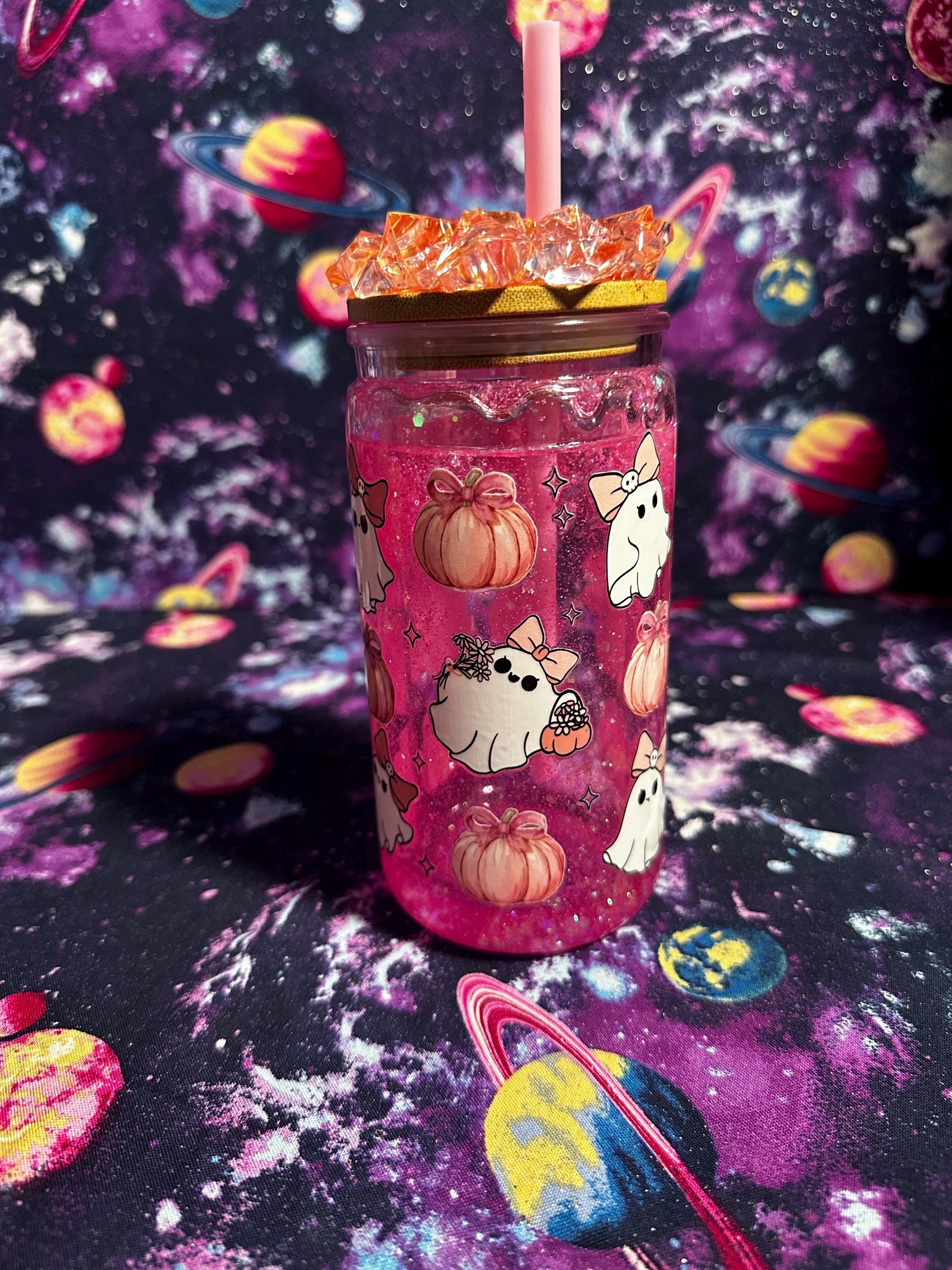 Filled with pink glitter, ghosts, and pumpkins — the ultimate cup for glam ghouls who love spooky season and sparkle.